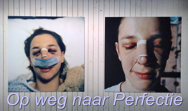 Een dolzinnige, maar ‘im Grunde’ heerlijk herkenbare tentoonstelling dus, vol cabareteske overdrijving: bijvoorbeeld een ‘realistisch’ filmpje over spontane ‘woekering’ van metalen proteses. En: een filmpje van tientallen mannen die met krukken op één been door de woestijn daveren (Uruzgan..?); doel: een enkel paar benen die aan een parachute omlaag komen… En: een tiental stokoude, zeer rijke dames die geheel alleen voor hun kapitale villa’s-met-zwembad zorgvuldig en omstandig uitleggen dat ‘schoonheid heel bepalend is’, hoewel het tegelijkertijd natuurlijk ‘vooral innerlijk is’. Hun mimiek varieert daarbij van depri-ontkennend tot zó gebotoxed dat er van mimiek in ’t geheel geen sprake meer is. Enzovoorts.