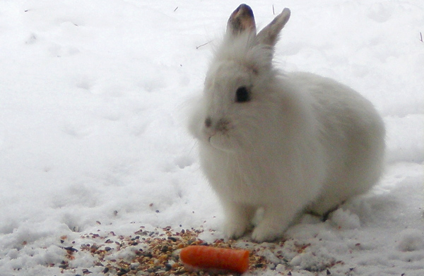 [Er lopen in ons park een viertal ooit ’tamme’ konijntjes rond. Deze witte meldt zich regelmatig nadrukkelijk bij ons aan – en is sinds kort net bereid een stuk wortel of brood uit de hand weg te grissen. Twee meter afstand vindt’ie nu wel genoeg om e.e.a. relaxed op te peuzelen.] Intussen kwam buiten ons hek nog een heuse Hinde traag tussen de stammen door stappen. De maandag ging, op een boodschapje na, braaf voorbij aan bijkomen van Niks en op dinsdag belde de arts aan Hanneke door dat ze, qua bloeddruk, moeiteloos 100 kan worden. We besloten voorts op die dag bij nader inzien toch maar niet naar de “atheïstische dominee” Klaas Hendrikse te gaan, die in het ‘Witte Kerkje’ van de NPB zijn lezing gaf over ‘God bestaat niet, maar mensen kunnen ‘m eventueel laten ontstaan‘. Eigenlijk vinden we iets soortgelijks al veel langer dan deze Klaas. In plaats daarvan besluiten we wél naar Mathilde Santing te gaan, die van de week in Ede optreedt. En op dit moment is Hanneke, op haar fietsie, door een lichte sneeuwbui onderweg naar een vriendin uit haar (en voor een stukje ook nog mijn-) jeugd. Uit deze opsomming moge blijken dat ook wanneer er niets gebeurt de dagen ‘prettig gevuld’ kunnen lijken. Vrij Veel Niks dus eigenlijk.