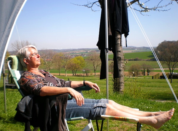 Er was een tijd dat wij kampeerden…  Sinds kort echter zijn we in het bezit gekomen van een verrijdbaar ReisPaleis(je). Bij wijze van proef plaatsten we dit rolpandje per 15 april op de Zuidhelling van de Gulpener Berg. Binnen zijn we nu van alle moderne gemakken voorzien. [Naast een koelkast met vriesvak, een driepits-gastoestel, warm en koud water zowel in het keukenblok als in het ’toilet’wasbakje en een kachel met hete lucht ventilatie, moet je dan denken aan: een vast (latten)bed, een eigen toilet(ruimte), vloerverwarming, satelliet t.v., een boiler, e.d.]  Een ReisPaleis, kortom. Toch zijn we ook veel buiten, want: er is sprake van een riant uitzicht over een zonovergoten Geudal, van langsfietsende ÁmstelGoldrace deelnemers, van pracht wandelpaden en van uitstekende terrassen met streekbieren (zoals Gerardus, Gulpener Dort  e.d).  Verder is er Veel Zon en is het ronduit Warm -uit de wind, dat wel-   Kortom: je hoort pas weer van ons te Lunteren vanaf vrijdagnamiddag de 23ste…
