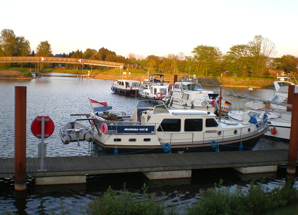 Seit einige Tage sind wir aufs ganz Deutches Wasser: erstmal aufs ‘Rütenbrock-Haren Kanal’, danach auf die Ems hinauf und jetzt auf das ‘Mittelland Kanal’, also gerade zum Osten gehend! Qua varen viel op hoe de roemruchte “Deutsche Pünktlichkeit” ook tot inefficiëncy kan leiden.  Zo bleken we wel degelijk vanuit elke waterslang waarbij stond “kein Trinkwasser” drinkwater te kunnen tappen: na ‘de legionella’ mag men hier domweg niet meer water tappen uit een slang langer dan een meter of tien – terwijl even doorspoelen voor gebruik óók gewoon voldoende is…  Voorts merk je rondom het Schutten dat er steeds een halve minuut of aanzienlijk méér zit tussen: Deuren Open – Licht op Groen – Zeker weten dat Allen Binnen zijn Gelopen – Deuren Dicht – Zekerheid dat iedereen Afgemeerd is – Kolkwater [in lineair toenemende snelheid] Toelaten (technisch volmaakt, maar oh zo traag) – Zeker weten dat de kolk écht helemaal Vol is – Deuren Openen – Zeker weten dat ze al wel enkele minuten Geheel Open zijn – Uitvaartlicht op Groen zetten…  Erg Gründlich dus, maar ook minimaal twee keer zo traag als te Onzent…Intussen zijn we naar schatting zo’n kleine 100 meter boven Zeeniveau en laat het landschap zich beschrijven als Bebost & Heuvelachtig met Agrarische Accenten.  Sedert Stadskanaal varen we ook nog ‘in klein Konvooi’: twéé Brandsmavletten 10.50 mtr., de ándere wordt bemand door Fokke & Sietske, twee diepFriezen uit Grou – beginnende zeventigers en óók op weg naar Berlijn!  Vandaag blijven we een dagje liggen in een kleine jachthaven nabij Recke – zo’n 12 km. het Mittellandkanaal op (voor kaartkijkers: direkt linksboven Osnabrück).
