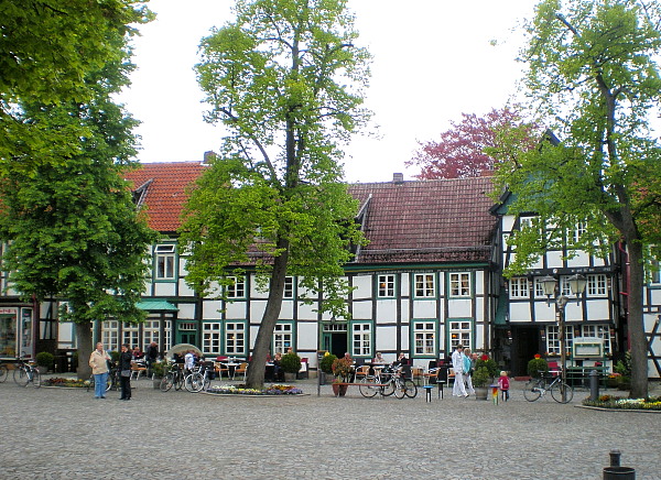 Dat is het woord voor de Duitse dorpen (en kleine stadjes): aangeharkt. Op zich zijn de huizen merendeels niet onfraai en lekker verschillend ontworpen, maar wel érg fors -om niet te zeggen megalomaan. Verder valt op dat aan de directe omgeving (tuin- en opritafwerking, straatrand en groen algemeen) zeker niet gelijke aandacht wordt besteedt. Rustig kan worden gesteld dat sprake is van weinig gevoel voor elegantie en een groot gebrek aan fantasie. Dit lijkt te voldoen aan onze wijd verbreide vooroordelen m.b.t. Duitsers (kijk bijv. ook naar hun auto-produktie): degelijk, maar qua vormgeving oersaai, gespeend van enige elegantie. Uiterst merkwaardig is het in dat licht echter dat bouwwerken en vormgeving van de omgeving zo’n twee tot vier eeuwen geleden hier juist helemaal niet dor en kil/praktisch blijken. Zie bijvoorbeeld dit fotootje van het dorpsplein van Bad Essen – sprookjesachtig á la Anton Pieck !