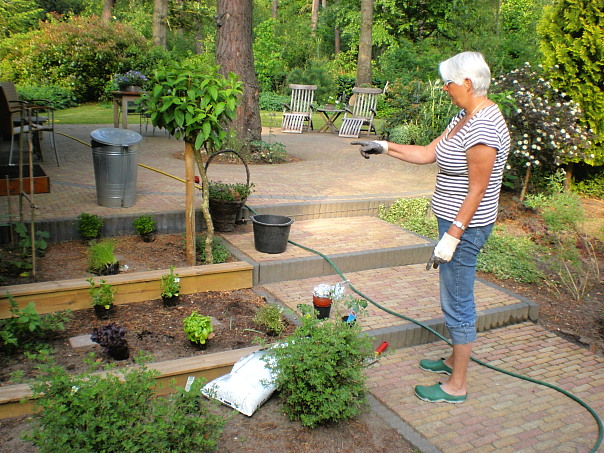 Verder heeft mijn Gade zich alweer bezig gehouden met het planten van wat meer keukenkruiden -zie foto- dat wil dus ook zeggen dat zij geheel rekent op de bevloeiings tactieken van zus Magda – en ’t moet gezegd: onze terrasbloemetjes stonden er zeer tierig bij na deze droge periode. (Maar ’t worden dus wel méér vierkante meters, schoonzusje…) Intussen ziet “ons” bos er alweer zeer zomers uit: volle donkere bladerdekken… We hebben elders nog geen plannen vooralsnog, dus: de koffie staat weer bruin! (en ’t bier geel; en de wijn … )