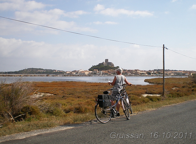 We verkeren sedert zaterdag j.l. te midden van de “Étangs” ( zout water meren aan de Middellandse Zeekust ) tussen Narbonne en het kustplaatsje Gruissan. Heel dichtbij het ‘Canal de la Robine’ dat Narbonne, middels 2 sluizen, met de Middellandse Zee verbindt. In maart 2007, tijdens onze overwintering hier dus, lagen we met de boot in ditzelfde kanaal midden in de stad Narbonne om Michiel voor een korte vakantie op te pikken. Vandaag ‘deden’ we een stuk van dit kanaal nog eens per fiets: met name de sluizen passeer je dan een stuk sneller! We zijn beland op een fraai geoutilleerde en nog voor meer dan 60% gevulde (!) camping met vele leuke -en vlakke- fietsroutes rondom naar stranden of kustplaatsjes en langs flamingo-wateren en wat dies meer zij. Het is nu ’s nachts zo’n 12 graden, ’s morgens ergens tussen 16 en 20 en ’s middags dik boven de 20 graden, dus het wandelen en fietsen geschiedt voornamelijk in shorts en t-shirts of zelfs een fladderend hemdje.