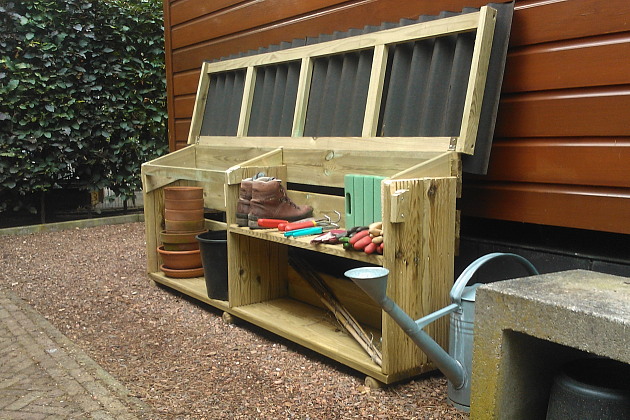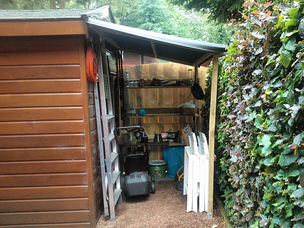 Daardoor kwam ook wat ruimte vrij in ons schuurtje, zodat daar een provisiekast (naast de vriezer) is geplaatst. Hierdoor kwamen weer twee plankjes vrij in de kast in onze werkruimte … enzovoorts ( klein wonen maakt praktisch!) Natuurlijk krijg je bij een Veluws Calvinistisch opgegroeid jongetje als ondergetekende de roemruchte zuinigheid er nooit echt uit (hoe bourgondisch er inmiddels merendeels ook wordt geleefd) dus moest al het rest-materiaal ook nog worden opgebruikt. Dat werd dus het grove tuinboel-opslagje op de foto hieronder.