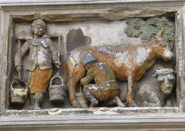 We hebben ons weekje Zeeuws Vlaanderen (nabij Oostburg), met Zus&Zwager genoeglijk doorgebracht. Tamelijk actief ook, achteraf bekeken: op de –doornatte– zondag na kon er elke dag gefietst, gewandeld of ‘geStad’ worden. We fietsten bijvoorbeeld naar Breskens, lieten ons overzetten naar Vlissingen en fietsten dan door voor een bezoekje aan Middelburg – en weer terug natuurlijk. Ook was er een “Visserijdag” in Vlissingen, waarbij vis, vissers(-gerij) en allerlei andere Zee Zaken te bezichtigen (en te proeven) waren. Bezocht werden verder oeroude stadjes als Sluis -een wondermooi Vestingstadje- en natuurlijk Brugge. Deze laatste stad bezochten wij al eerder, maar ze blijkt elke keer weer overweldigend qua middeleeuwse schoonheid. Zo zagen we er deze 16de-eeuwse gevelsteen: