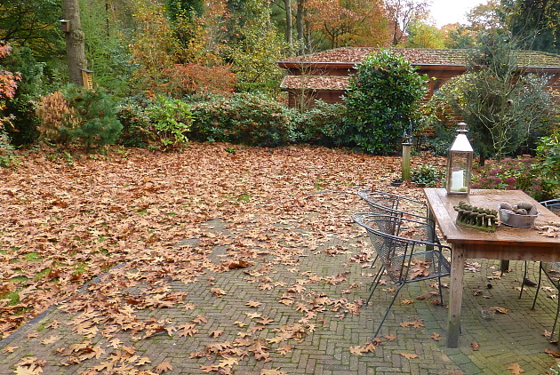 We zijn (al enkele dagen) weer genesteld in het grote Eikenbos. En via het nodige gekleum, geriebel en enige verkoudheidsverschijnselen in de voorhoofdsholte langzaam aan het acclimatiseren. De ochtend nadat we aankwamen lag er bij wijze van temperatuur-contrast zelfs enig ijs op steen, gras en blad rondom(!), maar nu overheerst slechts de nattigheid. Extra herfstig is het hier natuurlijk vooral ook door de dikke lagen goudbruin blad. [Op deze plek sneeuw je minder vaak in dan dat je in-bládert, want dat laatste is élk jaar zonder meer het geval.] ( foto)