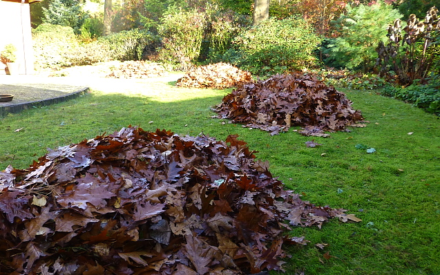Een bekende zegswijze luidt “Alle Zegen komt van Boven”. Welnu: wij worden hier telkenmale rijk gezegend! Een groot deel van het jaar nemen deze zegeningen de vorm aan van lustig neerdwarrelende dennenaalden. (Onze onvolprezen buurman Ruud haalde tijdens ons recent verblijf in het Zuiden nog een kruiwagentje of wat weg) In dit jaargetijde echter overheersen bladerrijke zegeningen veruit. Ik weet niet of de kreet “Op Hoop van Zegen” door de schrijver H.Heijermans (u weet wel, van “de vis wordt dúúúr betaald!”) is ontworpen of al eerder in onze taal was geworteld, maar: wij hebben hópen zegen! Voorlopig zes hopen om precies te zijn. Zojuist hebben we die middels élf volle kruiwagens afgevoerd. Voorlopig dus, want alleen de Amerikaanse eiken zijn nu praktisch geheel kaal. Hollandse eiken, berken, andere incidentele boomkruinen en diverse struiken zullen ons echter vooralsnog bijna even rijk blijven zegenen. Ik hoef jullie dus niet te vertellen dat wij het schone adagio “Tel uw Zegeningen één voor één” maar NIET in uitvoering hebben genomen. We zouden dat simpelweg niet kunnen bijhouden. Ter Acacia 23 tellen wij onze zegeningen nu dus per kruiwagen … “Dat’s niet Verkeerd!” zou een ex-wandelgenoot gezegd hebben. En ze heeft gelijk: rijk gezegend worden wij van boven. Zelfs als onze huis-eekhoorn daaraan niet bijdraagt.