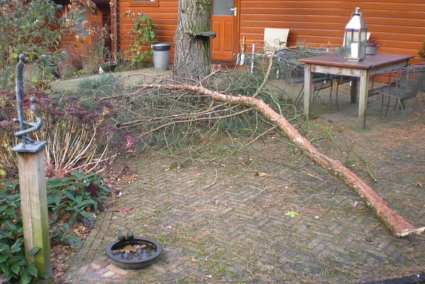 Toen we ’s avonds laat weer bij onze boshut aankwamen bleek er vanuit de lucht een aanval op ons terras te zijn gepleegd: een zeer forse (lage) tak bleek uit onze terras-den te zijn gewaaid. Dat moet een forse smak zijn geweest, want het betrof zo’n zes meter tak en waar het (bovenbeen-)dikke uiteinde de stenen had geraakt zat een aardige deuk met een klont houtvezel in de stenen. Wondermooi gemikt, dat wel: want het ding had kans gezien werkelijk niets te raken. Potplantje, kaarslamp en beeldjes op de buitentafel, tuinstoelen en de kabouter aan de andere kant, de kap boven de voordeur – allemaal nét gemist. Ronduit keúrig in het lege midden van dit alles neergekwakt… Ik zei ’t al eerder: dat hebben wij weer – het glas blijft almaar gewoon vól.