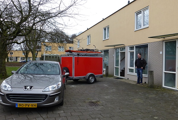 Met dank aan onze Voorthuizense familie relatie, die een perfecte aanhanger ter beschikking stelde –zie foto– zijn er inmiddels heel wat spullen verplaatst. We hebben bijvoorbeeld ook weer het één en ander aan “vroegere huisraad” uit onze sedert 2006 bestaande opslag in Dronrijp opgehaald. [Wat daar nu nog staat hebben we pas nodig als onze koters weer zijn ‘doorgeschoven’ en we zelf fulltime de Stempelslaan betrekken.]