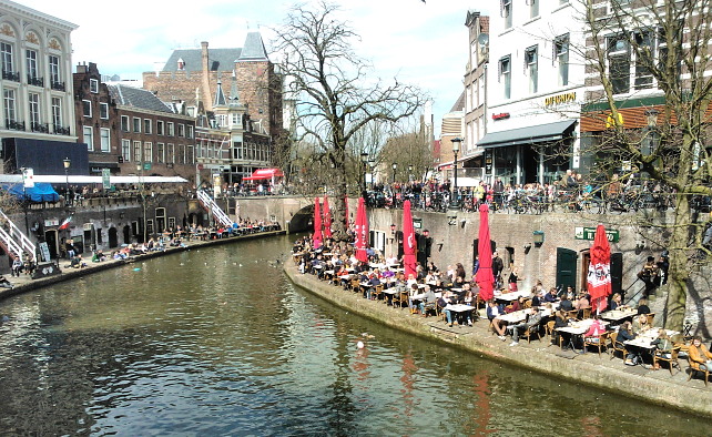 Sedert dinsdag j.l. zijn wij woonachtig op -en klussend bezig in- de Griftstraat 124 te Utrecht. We maken de woning klaar voor makelaar en verkoop. En verkennen natuurlijk Utrecht verder; was dat eerder vanuit het Zuidwesten, nu benaderen we de stad vanuit het Oosten. En merken dat we ons al wat ‘Stadser’ gaan gedragen. Geen voorraad vooruit kopen bijvoorbeeld, maar dagelijks voorzien in de zich direct aandienende behoefte – ongeacht de dag of tijd. Dit wordt overigens ook sterk bevorderd door het feit dat de koelkast nog niet is afgeleverd, zodat we uit een (dichtritsbare) tas putten die op het achterterras staat. Het is daar ook gemiddeld tussen de O en de 8 graden, dus veel problemen geeft dat verder niet. We hebben behalve de getrainde ‘benenwagen’ ook prima (vouw)fietsjes paraat en dat is maar goed ook, want de auto kunnen we niet dichterbij kwijt dan op zo’n tien minuten lopen! We schieten al lekker op: bijschilderen, nieuw buitenlampje, opnieuw meubileren e.d. is per vandaag klaar. Nu nog wat aankleed details zoals iets aan de muur, een beeldje in de hoek, wellicht een plant binnen en het nodige frisse groen op ’t terras en laat die makelaar dan maar opdraven. Later kunnen we dan de terrasdeur wel van binnen en van buiten (en de toegangsdeur van buiten) schilderen – op een droge, niet te koude dag. Intussen is het, net als in de rest van Nederland, volop Crisis in Utrecht zoals je op de foto kunt zien klik er maar op