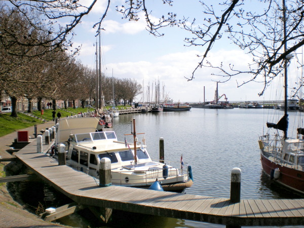 Vanuit Lemmer staken we op een rustige, zonnige (maar nog te koude!) dag over naar Enkhuizen. Hier kregen we de dagen daarna te maken met zeer stevige Oostelijke wind. (O/NO, tot 6 Bf.) We bleven dus, ‘verwaaid’ zoals dat heet, wat langer ter plekke – heel prettige stad overigens en de oude binnen haven is een prachtplek, daar niet van. Gisteren was de wind nóg vier á vijf, maar die zou vandaag weer verder aantrekken, dus toch maar over gestoken… Richting Staveren was het plan, wind en rollers van opzij – dus oploevend aansteken en afrijden: ooit met de zeilboot een beproefd recept. Als echte zeilers hadden alles wat om kon lazeren al geborgd (behalve de boeken eigenlijk) en dat bleek maar goed ook. Want met zo’n kloek maar traag sturende vlet viel er niks ‘aan te steken’. Om te voorkomen dat we niet ál te gek werden rondgesmeten kon ik eigenlijk maar één ding doen: zozeer de wind op kop dat we enigszins tegen de rollers in koersten. Dat werd dus aankoersen op een punt op de NOpolderdijk, ergens tussen Lemmer en Urk. Toen we na zo’n anderhalf uur op 2800 toeren (blijft bij forse tegenwind én harde golfslag zo’n 11 km/u aan werkelijke voortgang van over) die dijk wat meer naderden konden we pas afvallen en koers zetten naar de grote Frieslandsluis bij Lemmer. Hoezeer we doorelkaar zijn geschut blijkt wel uit het feit dat we beiden nog flink spierpijn hebben van al dat schrapzetten: Hanneke aan een arm en ik aan een bovenbeen. We zijn, zoals de heer Bond, James Bond, pleegt te zeggen: “shaken, not stirred..”