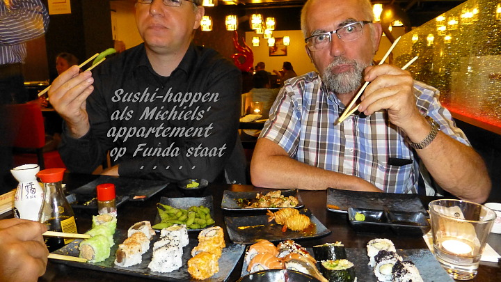Ja, lieve lieden: het is dus zover. Michiel zijn appartement -waar wij in deeltijd in wonen- kan zó onder ons gat vandaan worden verkocht. Het staat vanaf dit weekend op FUNDA.nl Kijk zelf maar uitgebreid in dit huis rond op: http://www.funda.nl/koop/utrecht/appartement-48702289-griftstraat-124/ (voorgaande adresregel kopiëren dus en daarna in de bovenregel op je scherm plakken en aanklikken of helemaal overtypen als je ’t knippen & plakken niet beheerst) Michiel vierde deze mijlpaal na zijn 15-jarig verblijf op dit adres gisteravond met een zeer uitgebreid Sushi-diner. We hadden daarbij elk 5 gangen van elk 5 stuks sushi gerechten naar keuze te gaan; waarna nog van een riant toetjes-buffet gebruik kon worden gemaakt. Welnu, wij kwamen niet verder dan de vierde ‘gang’ en zitten nu (een volle dag later) nog uit te buiken…