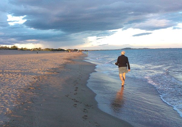 Helaas werden wij ook bij hen dit jaar ingehaald door het rotweer dat zo’n beetje het hele Europese vasteland sinds meer dan een week teistert: régen en temperaturen rond 14 á 15 graden. Bovendien was de voorspelling daar dat dit nog wel een dag of wat zou duren… We zijn daarom maar in één keer doorgekacheld naar de Middellandse Zeekust. (Zo’n 500 km. verder, dus een uur of zeven ‘verplaatsen’, als je de pauzes onderweg meerekent) Daar kwamen we gisteren rond 16.30 uur aan (een camping met strand tussen Agde en Béziers) en het bleek er rond die tijd 24 graden Celcius. Wat een genot is het toch om een compleet huishouden neer te kunnen zetten waar je maar wilt! (In dit geval voor € 14 per nacht, incl.) De weersvoorspelling luidt hier nu: de komende vijf dagen droog, half bewolkt tot geheel zonnig, en zo’n 24 graden C. in de (na-)middag. Die eerste avonds maakten wij dus meteen maar een lekker lange strandwandeling …