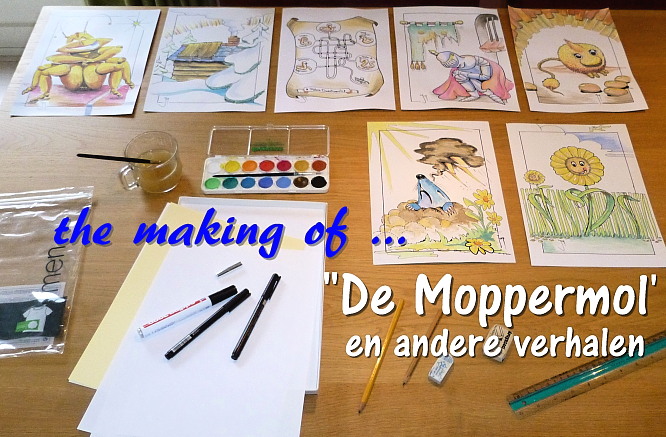 Alweer een dikke 10 dagen in het jaar 2014. Die dagen kenmerkten zich hier door twee zaken: boekvoorbereidingen en veel geloop. Allereerst het geloop: we hebben de vaart er in qua zin in buiten, conditie en dergelijke. Ook goed om wat ‘feestdagen-spek’ te elimineren, hopen we natuurlijk. Een opsomming: Zaterdag 4 > Wekeromse Zand kriskras (12 km.) Zondag 5 > ’t Zand nog eens, nu een routewijziging uitproberend voor mijn Wandelpooltocht van woensdag, want er bleek een prachtige nieuwe wildkijkhut te zijn opgebouwd aan de Valkse kant van dit gebied(ca. 13 km.). Woensdag > mijn Wandelpooltocht “Lunteren & de Oudheid”. Er mochten 10 wandelaars met ons mee en ik had 15 aanmeldingen, dus enkelen moesten teleurgesteld worden. Maar de 22ste gaan we weer; dan dus nieuwe kansen(25 km.). Gisteren (vr.) > klompenpad “Dashorsterpad” boven Scherpenzeel (met aanloop ca. 14 km.) en morgen zijn we, nu al met voor-plezier, het klompenpad “Molenbeeksepad” vanuit Wolfheze ( 16 km.) van plan. Lekker op dreef dus – zelfs voor ons doen. Intussen vindt in onze boshut “the Making of” plaats van mijn eerste verhalen-/voorlees boek voor kinderen: “De Moppermol en andere verhalen.” Daarvan moest ik, naast de keuze voor de opzet van het boek (verhalen volgorde, illustraties e.d.) het manuscript nog een (flink) aantal malen doornemen om finale keuzen te maken in tekst, (voor-)leesbaarheid, de interpunctie in het algemeen en natuurlijk ook om eventueel achtergebleven type- en spelfouten eruit te halen. Daarnaast moet gedacht worden aan dingen als: wat moet er op de achterflap komen over de auteur (met een geschikt fotootje daarbij), welk stuk verhaal is bruikbaar als introductie-tekstje op de site van de uitgever, enzovoorts. En tenslotte moest er een omslag ontwerp worden gemaakt én 12 illustraties in kleur gezet worden om gescand te kunnen worden aangeleverd.
