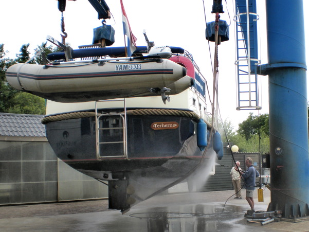 Zondag j.l. reden we naar ons schiphuis in Terhorne, haalden de boot daar uit en gingen onder de scheepskraan van onze thuishaven “Oksewiel” te bed. ’s Morgens even na achten werd het schip op de kant getakeld en onder de waterlijn schoongespoten met een hogedrukspuit.