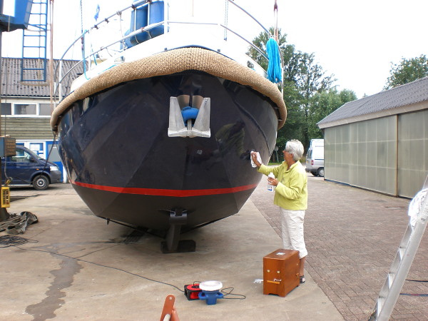 Daarna begon voor ons het zware werk: eerst met een krachtige vuiloplosser (spatjes daarvan bijten fors in de huid..) de waterlijn stevig nareinigen en daarna de hele onderkant in de anti-fouling rollen. [Wij hadden de onderzijde nog nooit waargenomen dus we waren ook zeer geïnteresseerd in de konstruktie van roer, kimkielen, boeg- en hekschroef e.d.] Mede dank zij de millieu-eisen is die anti-fouling tegenwoordig een anthracietkleurige rubber achtige laag, waar binnen koperoxide is opgenomen die de aangroei van waterpokken en wieren weert. Die laag bleek bijzonder zwaar op te brengen: halverwege elke pot verf wordt het rollen al ’taaier’. Gelukkig was het lekker droog weer en in de tweede helft van de (ma.)middag zat de onderkant in de aangroeiwerende verf. Wij gingen dus naar ons logeeradres, een vriendin in Franeker, en traden de volgende ochtend om 8.30 uur weer aan, nu om alles tussen de waterlijn en de kabelaring (de rest van het ‘onderschip’ dus) grondig na te kijken en eens goed te poetsen en in de ‘harde’ was te zetten.