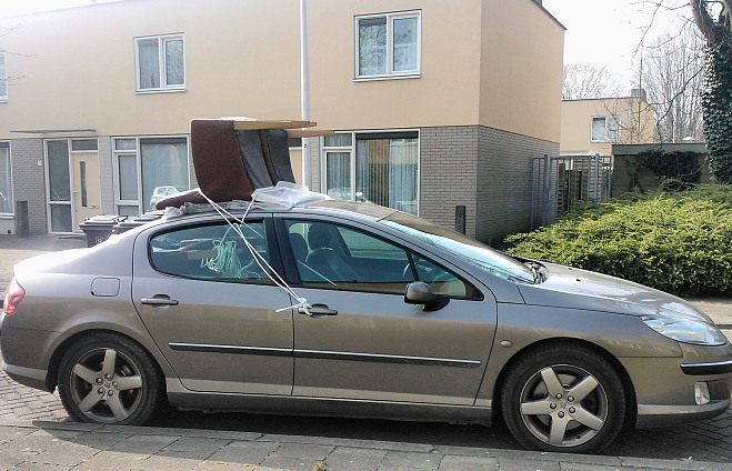 En dat dan wel via de allerfraaiste route, de ‘riviertjes’-route: die gaat achtereenvolgens langs de Vecht, de Angstel , de Holendrecht en de Amstel. Na 47 km., net binnen de Amsterdamse stadsgrens had Hanneke naar eigen zeggen een volkomen vierkant achterwerk opgelopen en dus stapten we in het nabijgelegen station Amsterdam-Duivendrecht op de trein terug. We kregen verder drie maal visite (twee Friese vrienden en een tweetal zussen & zwagers) – die wilden allemaal wel eens zien waar we nu weer waren beland natuurlijk(!) Intussen wandelden we een dagje vanaf Santpoort-Noord dwars door de (natte) Kennemer Duinen naar zee en daarna nog zo’n tien km. over het strand naar Zandvoord. Dat viel nog niet eens mee, want het was net hoog water, zodat er nauwelijks een ‘harde’ strook zand langs het water te bekennen was. (Maar we hadden gelukkig welbewust een route gekozen met de wind achter) Het traag doorgaande verhuizen levert soms vreemde beelden op in onze straat: