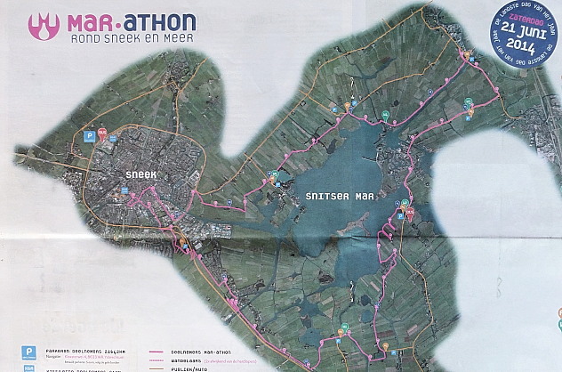 Wij krijgen een naam-badge om waarin electronica zit: de doorgang langs de controle punten wordt automatisch geregistreerd. Wat nog grappiger is: hun website is www.mar-athon.com (want “mar” staat voor “meer” in het Fries en deze route loopt helemaal rond het Sneekermeer) – je kunt daar nu gewoon op rondkijken natuurlijk. Maar vanaf nu kun je ook melden over welke wandelaar je op de hoogte wenst te worden gehouden: en dan krijg je -GRATIS- een berichtje op je mobiel wanneer die wandelaar weer een controlepost is gepasseerd… Voor deze dienstverlening meld je je hier aan. Reuze grappig toch? Nog geen idee natuurlijk of wij – ook in deze temperaturen- zo’n stevig eind tussen 9.10 uur (onze starttijd) en 20.00 uur (eindtijd) kunnen stiefelen; maar we gaan er gewoon voor! De hele zaak is, qua starttijden en afstanden, zo gepland dat alle 6000 (!) deelnemers [-1500 halve Marathon hardlopen, 1500 halve Marathon wandelen, 1500 hele Marathon hardlopen én 1500 hele Marathon wandelen] allemaal ergens tussen 19.00 en 20.00 in Sneek arriveren. Toenemende drukte naar de finish toe dus. Aansluitend is er een groot feest rond de watertoren gepland, met ‘de Kast’ en dergelijke. Wij storten ons in het gewoel vanaf het camping-veldje bij jachthaven “de Domp”, midden in Sneek – waar we in oktober j.l. al een plekkie reserveerden. Daarná gaan we nog een weekje aan het IJsselmeer in Gaasterland staan – om ‘af te kicken’ en allerlei oude bekenden aan te fietsen… Een vrolijke groet aan jullie allen ( alle twee dus, ofzo…)