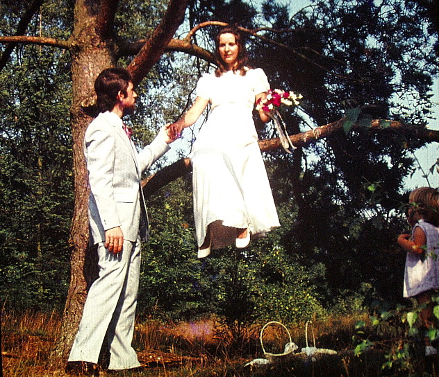 Bijgaand beeld is gedateerd op 30-07-1971. Wij werden vandaag dus 43 – als formeel erkend duo. Om dat te vieren gaan we vanavond met onze Knapen in een uitgebouwde glazen serre zitten, zo’n 6 meter boven het water van een fraaie binnenhaven. Op ongeveer 800 meter van thuis. (Tenzij het nog héél warm is: dan nemen we zo’n vijf meter lager plaats op het terras aan ’t water) Daar laten wij ons vervolgens uitbundig verwennen met diverse spijzen en drankjes… En morgenvroeg vertrekken we dan -met zwaarbeladen fietsen- per trein naar Maastricht. Een luttel aantal kilometers daarvandaan (in Bemelen) hebben Oudste Zus & Bijpassende Zwager hun stacaravan als zomerverblijf. Wij overnachten daar bij hen en fietsen vervolgens -in twee á drie dag etappes- terug naar Utrecht. Vandaar die zwaarbeladen fietsen: tentje er op, slaapzakken, luchtbedden, gasflesje, klein keukengerei, stoeltje, kleding, e-books. enz., enz. … De route hebben we, via de bekende knooppunten, al uitgezet ( totaal ca. 210 km.), maar we plannen natuurlijk geen dagafstanden of overnachtingsplekken vooruit. God zege de greep! Ben dus benieuwd waar we onderweg zullen belanden. Een andere zus vertrekt morgen naar de Moezel. Waar alle andere geliefden & bekenden in deze uitgaanstijd rondhangen weet ik niet, maar vermaken jullie je intussen vooral allemaal op je eigen wijze!