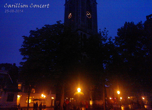 Afdalen onder het Domplein bleek een geweldige ervaring. Eerst krijg je een video-film te zien die de geschiedenis van Utrecht over tweeduizend jaar (in acht minuten!) beeldend schetst. Daaraanvolgend is er enige ander uitleg via plattegronden, een voorbeeld van een archeologische locatie én enkele ter plekke opgegraven voorwerpen. Dan voert een gids je mee en daal je af tot zo’n acht meter onder het huidige Domplein. Daar bevind zich het straatniveau uit de Romeinse tijd! Je krijgt elk een bovenmaatse zaklamp mee met een oortje eraan, waarmee je eigener beweging door zwak-verlichte gangen kunt dwalen en het nodige oudheidkundige materiaal kunt uitlichten. Op veel strategische plaatsen is ook een sensor geplaatst: als je lichtbundel die aanraakt dan krijg je een directe toelichting op wat je ziet via je oortje. Een prima systeem; het geeft je de gelegenheid in eigen tempo en naar eigen interesse te verkennen. Halverwege barst in beeld (geprojecteerd op eerder deels verborgen metalen schermen) en stevig geluid een video animatie los van het instorten van het middenschip van de Domkerk in 1664. Al met al een prettig indrukwekkende en goed begeleide excursie van ruim een uur. Een aanrader! [Elk uur start een groep van ca. 20 mensen. Wel eerst boeken -via de Domunder Website- want men zit meestal al een dag van tevoren vol! Hoewel … nu is ’t natuurlijk geen vakantietijd meer.] Verder is hier in Utrecht gewoon altijd veel meer te doen dan een mens aan kan: in de zg. “Uitloper” staan wekelijks doorgaans wel 100 uitgaans mogelijkheden opgesomd (…) Sommige dingen vrágen natuurlijk om een deelname. Eén daarvan was, wat ons betrof, het “Slotconcert voor dit seizoen” op het carillon in de Domtoren. Deze concerten vinden in de zomerperiode plaats elke maandagavond van 20.00 tot 21.00 uur. Zo ook op 25 aug. j.l. Alleen was er nu ook een piano met versterking de toren ingetakeld. Er werden vervolgens 17 nummers van ABBA (die 40 jaar geleden alweer ’t song-festival wonnen) over de stad uitgestort, bewerkt voor carillon & piano(!) Wij stonden een groot deel van dit concert, na eerst op een lekker terrasje achter een wijntje te hebben geluisterd, op het Domplein.