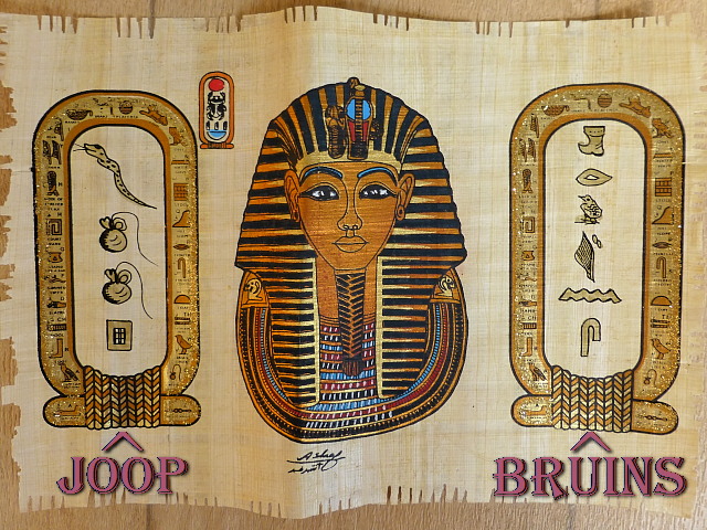 En gisteren ontving ik, tot mijn verrassing, van hem een stuk ‘Papyrus’ waarop, links en rechts van het portret van Toet Ankh Amon, mijn naam in hiërogliefen is weergegeven. Leuk hè ?!