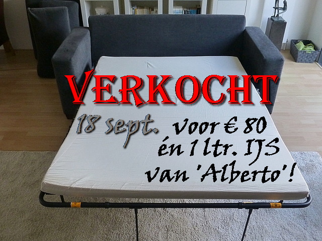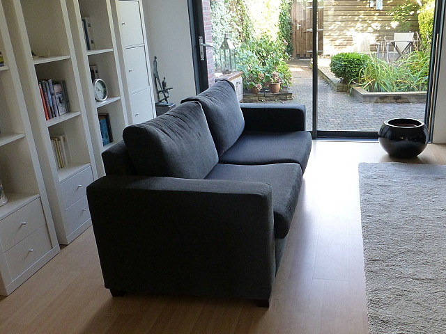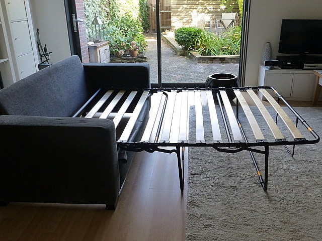 Het onze wel: wij kunnen er onze voortreffelijke zit(+slaap)bank NIET door omhoog brengen… Dus is hij plotseling “overcompleet”. Het is een stoffen bank, die wij in Lunteren nog full time gebruikten en die wij hier op onze ’tweede kamer’ (boven) wilden plaatsen. Hij zit uitstekend en ziet er nog puntgaaf uit. Omdat er een mooi lattenbodem bed uit kan rollen (-slaapt ook prima!) is deze bank vrij zwaar en niet te demonteren We hebben ‘m nu dus over. Heeft iemand in jullie kring er trek in? Het is een top kwaliteit bank én een prima extra bed – desgewenst: je ‘rolt’ de lattenbodem er mét matras zo uit. Maten – bank: 190 breed, 90 diep en 80 hoog. Slaapmaat: ca. 200 x 140 Zie foto’s – als er een liefhebber is laat het direct even horen.