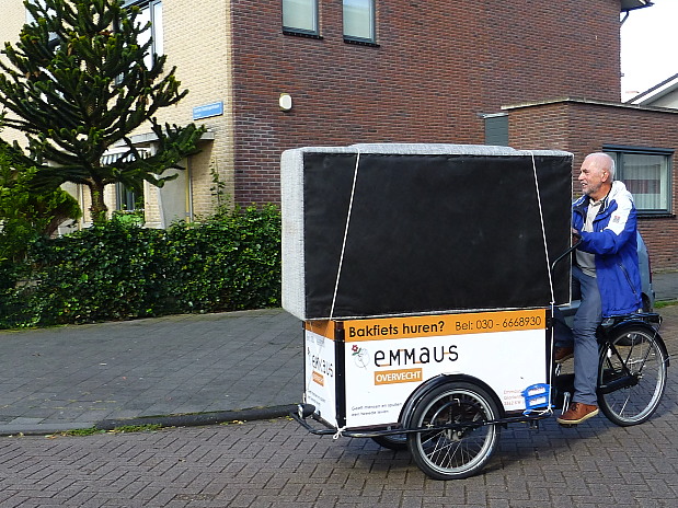 Dat zie je ook hierboven: onze slaapbank verkocht en daarna een kleiner bankje (een zg. “love-seat!“) op de koop getikt. ’t Was voor beiden -via Marktplaats- zo gepiept, dat wel. Maar de love-seat stond elders in Utrecht en ik was het gesleur met ‘Pak ’n Bak’ bakken goed zat – dus vond deze voorlopige afronding van ons interieur per bakfiets(je) plaats… Voorlopig, omdat het door ons bestelde definitieve meubilair pas eind november z’n opwachting zal maken (,mits niemand in die lijn tussentijds failliet gaat natuurlijk). Maar verder zijn we -en voelen we ons- nu al weer heel aardig ‘genesteld hier’ op de Eerste Oosterparklaan 132.