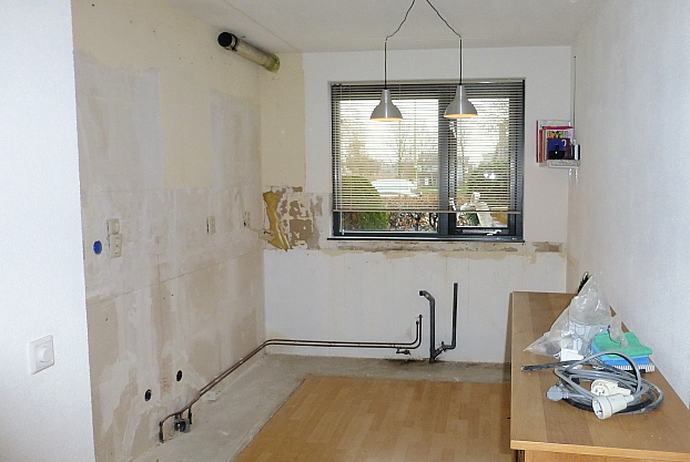 Intussen wordt hier gesloopt en (hopelijk ook) herbouwd: met een geheel nieuwe keuken als gewenst eindresultaat. Wij wonen dus tijdelijk op onze bovenkamer en eten warm uit de (losstaande) magnetron of buiten de deur…