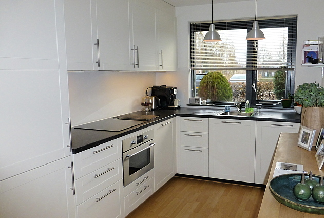 De keuken is af. We hebben er een combinatie oven in laten zetten; zo’n ding is van alle markten thuis: een ‘klassieke’ oven met boven en onderverwarming, een hete lucht grill/oven, een magnetron, en zo nog wat functies. Verder is er een inductie kookplaat ingebouwd. Voor de laatste hebben we nieuwe pannensets aangeschaft – het meeste van ons (stokoude) spul was niet (of niet zo goed) voor inductie geschikt. Het bleek ons al snel uitstekend te bevallen: het is aanmerkelijk sneller heet dan gas, maar alleen de pan met inhoud wordt zo heet, dus geen inbrandende plaat – sterker nog: deze is al vrij snel weer aanraakbaar. Bovendien heeft onze inductieplaat alleen maar ’touch-screen knoppen’, dus geen uitstekende delen – je veegt ‘m kortom zó weer schoon. Bovendien zijn er 10 warmte standen per plekje, dus ook héél zacht sudderen is geen probleem meer. De afzuigkap erboven is geheel onzichtbaar in een kastje gebouwd – waarvan dan nog twee legplanken bruikbaar zijn. Onder die kastjes zitten LEDstrips die met afstandbediening aan/half of uit gaan. Verder beschikken we over een forse, heel praktische pannenkast (in de hoek), een tamelijk geruisloze vaatwasser en zo meer. ’t Kost wat ‘maar dan hebbie ook wat’… We hebben bewust gekozen voor een heel lichte combinatie, want we vonden de keuken vrij donker qua buitenlicht. [ Er op klikken = vergroten ]