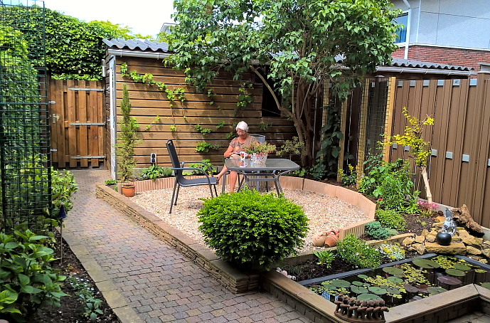 De gehele route uiteraard met onze vaste matroos Kea. Het echtpaar F&S, onze ‘Berlijn-gangers’ van weleer, bleken ook te water in dit hoge noorden en na enig GSMverkeer troffen wij elkaar bij Dokkumer Nieuwe Zijlen voor een rondje bijkletsen-aan-de-steiger. Qua weer was er geen pijl op te trekken vorige week: hete middagen in korte broek werden afgewisseld met stortbuien evenals stille dagen met windvlagen. Gelukkig is een boot doorgaans aan alle kanten weer- en waterdicht; en wij ook!. Overigens bleken de weergoden, zo die bestaan, ons en detail uiterst welgezind: meestal regende het tijdens het varen en werd het droog juist voor wij aanlegden. (Of waren wíj nu zo leep…) Wij leverden de boot af bij de eigenaar, Kea bij haar zus A. en onszelf bij W&T, onze voormalige overburen tot 2006 (Ealahuzen) waar we ons een nóg een ronde bijkletsen lieten welgevallen. Vrijdag kwamen we later in de middag thuis aan – en de schutting stond er! Met dank aan rechter buurman Koos, die overigens dit weekend weg is dus die dank komt er nog aan (in de vorm van een pakketje Fryske smikkelwaren).