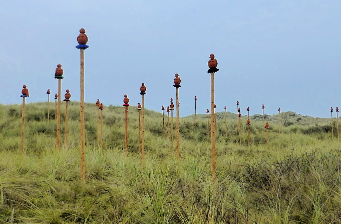 Dat valt nog niet eens mee, want in elk dorp -en op diverse duinlocaties- worden je zomaar ruim honderd werkjes van bijvoorbeeld een vijf tot wel tien creatievelingen voorgeschoteld. Zie dan maar eens je ‘opname vermogen’ een beetje naïef ontvankelijk te houden. Intussen is het natuurlijk gewoon leuk en heel bijzonder om, al wandelend/fietsend/rijdend over een herfstig eiland, tussen zo’n enorme variatie aan scheppingen en scheppinkjes door te scharrelen. Dát is, naast de écht fraaie werken natuurlijk, dan ook vooral de charme van dit gebeuren (voor ons was het al de derde keer in vijf jaar). Verder beklommen we de vuurtoren, waaiden zowat in zee en lieten onze brillen en oren volstuiven met fijn zand.