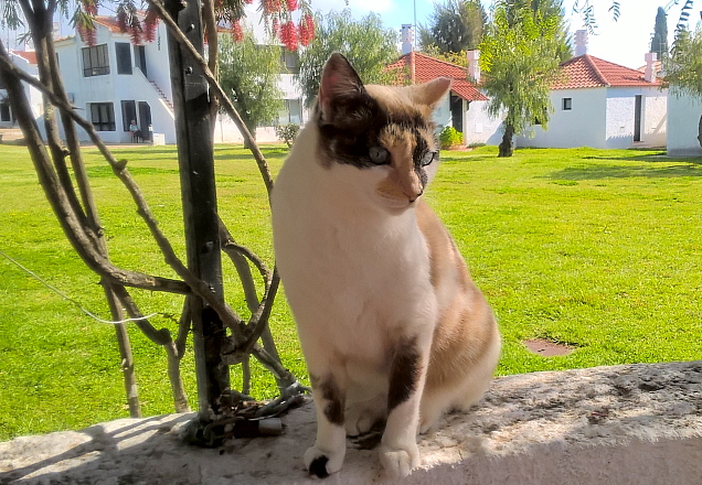 In Spanje fietsten wij van Ayamonte naar de Vissersplaats/Badplaats Isla Cristina ( ca. 15 km.), aten daar een Paëlla da Marisco (Paëlla Zeefruit), keken rond en fietsten weer terug – ca. 15 km. over grinderige zandpaden door een gebied van zee-moeras. Weer de grensrivier over natuurlijk en dan ( ca. 6 km.) doorfietsen naar Monte Gordo (de meest ‘Nederlandse’ plaats hier – je kunt er zelfs bitterballen kopen(!) Toen naar het meest nabijgelegen station ( 2 km.) en verder treinen naar Luz de Tavira, vandaar was het nog ca. 6 km. fietsen naar onze bungalow. Al met al zo’n 45 km. fietsen en 55 km. treinen (de fiets mee in de trein is hier gratis). Vertrokken om 8.45 uur. Weer thuis: 19.00 uur (NB. Soms gaat hier maar eens per 2 uur één trein!) Wandelen doen we natuurlijk ook. Bijvoorbeeld van hier via het vissersdorp St. Luzia naar Tavira en daar met de pont naar het Ilha de (= eiland van) Tavira, 8 á 9 km. Dan langs het strand naar Barril ( tot 1965 een zomerdorp in de duinen voor Tonijnvissers, nu een recreatie plek) en dan door het natuurpark terug naar ‘Pedras del Reï”, waar onze bungalow staat, ca. 8 km. Een prachtwandeling, broodjes en drinken mee; weg om ca. 9.30, terug ca. 14.30 uur. Verder ontmoetten wij hier een bijna tamme jonge vos (die schooit in de schemering in de buurt van het restaurant z’n kostje bij elkaar), kwamen we een wel zeer grote pad tegen, zien we regelmatig de prachtig bevederde Hop en hebben we inmiddels een ‘aangelopen huispoes’ die we gezien haar kleur “Cappuccino” hebben gedoopt.