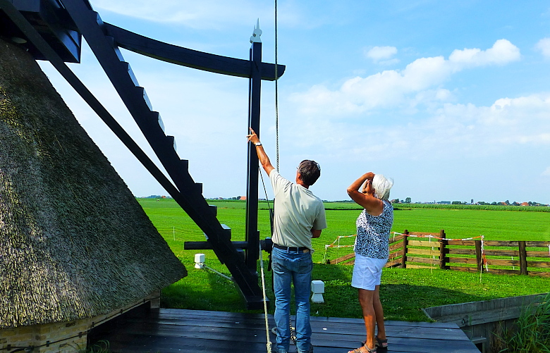 Hanneke kreeg er bijvoorbeeld instructie van een molenaar hoe een “Spinnekop” te bedienen. Ook ontvingen en maakten wij visite’s van -en bij- zeer bevriende lieden die nog altijd in dit Fryske lân wonen. Aan het einde van dit weiland-en-wind-weekje liep ik tegen een vlijmende kiespijn aan, die slecht te onderdrukken bleek met paracetamol of dergelijke. Inmiddels is de zenuw ter plekke gelukkig krachtdadig verwoest. Maandag a.s. worden afrondende restauratie werkzaamheden afgerond. Inmiddels is mijn vriend Thijs vanuit Portugal al een klein weekje in ons lieve platte landje. Hij bezoekt er zijn kinderen, kleinkinderen – en z’n moeder, die vandaag 90 werd. Hij logeerde hier een dagje of twee, vooral om bij te komen (voor zover dat lukt natuurlijk met een pratertje als ondergetekende om je heen, maar ’t schijnt dat ‘t elders dus nóg drukker is ) Morgen vieren wij met onze zonen, op bescheiden wijze, ons 46 jarige Huwelijk, doch dáár over –