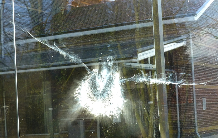 De titel moet je dus létterlijk nemen: deze afdruk liet het beestje achter toen het zich op 21 maart dit voorjaar te pletter vloog tegen een perronruit op het Lunterse stationnetje (!)
