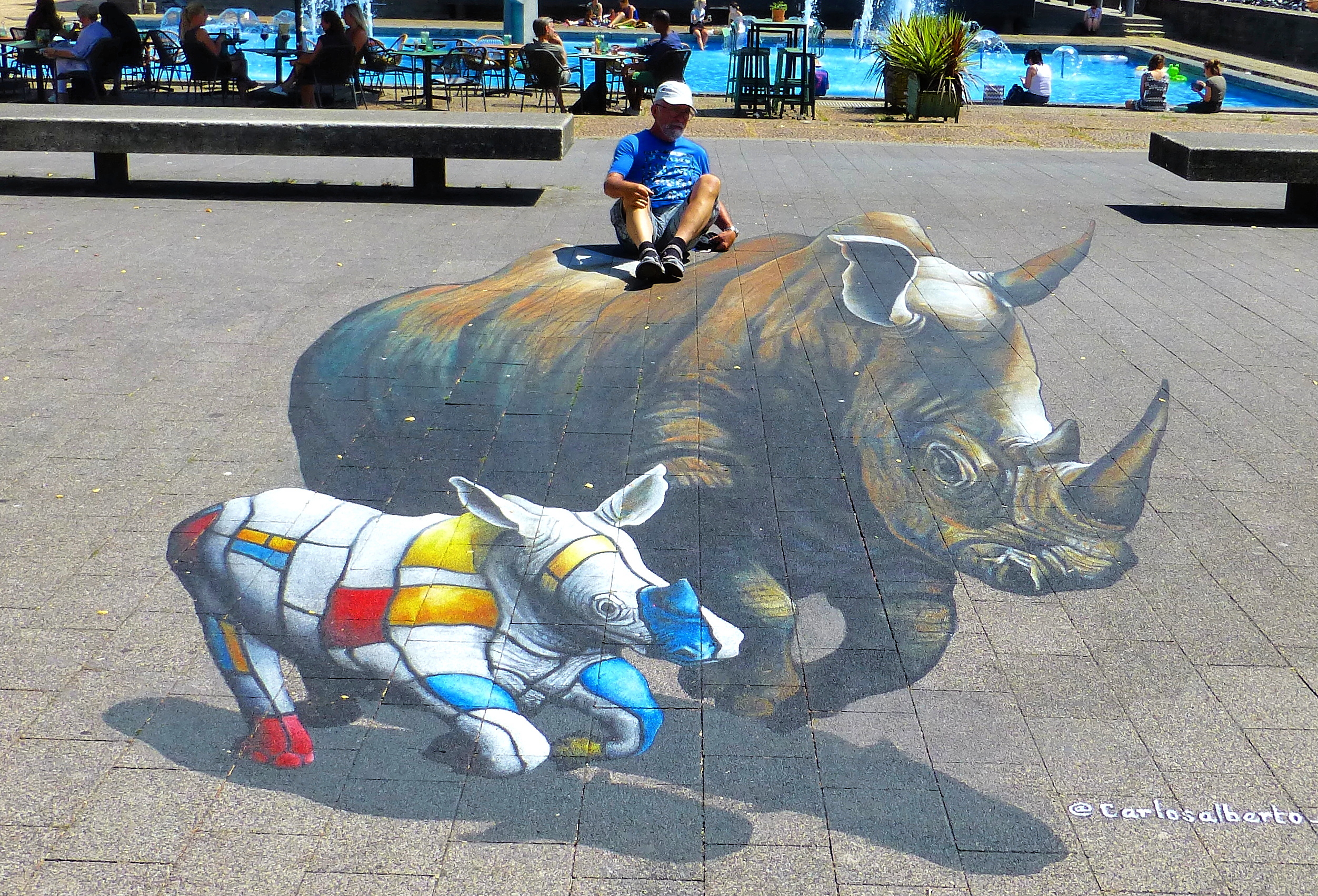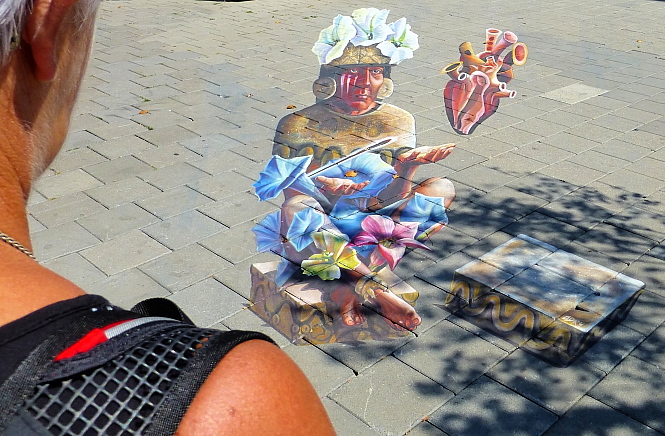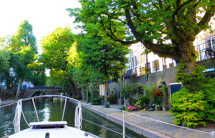 Niks doen, niks !, lijkt de enig juiste overlevingsstrategie bij deze temperaturen …  En dat al na ‘slechts’ enkele weken zo’n 25 graden op de thermometer.  OK – én vijf á zes “Tropische dagen” (30 tot 35 graden). Wereldwijd gezien zijn we dus duidelijk (onderkoelde-)watjes. Hoe hebben al die Nederlanders dat destijds geflikt, ‘de Boss’ uithangend in “Nederlandsch Indië” ?.  Nou ja: zij deden grotendeels ook al niks natuurlijk: daar had je (uitsluitend donkerbruin) personeel voor.  Maar goed: zij hadden toch geen airco, diepvriezers e.d.  bij de hand.  Wel leefde men gemiddeld járen korter, dat was bekend en daarom telden ‘tropenjaren’ dubbel. We worden dus twéé keer gepakt met deze tropische dagen: eerst zweet je ze door – en daarna leef je even zoveel dagen korter (! ja, ja !)  Wij hebben te onzent ook geen airco, alleen een piepklein tafel-ventilatortje en een mooi trage plafond-fan boven ons bed.  Natuurlijk gaan we strategisch om met de omgang tussen ‘buiten’ en ‘binnen’ – deuren, ramen, zonwering, nachtelijk doortochten, weinig/kort koken, enz.  Tóch stijgt de binnentemperatuur natuurlijk heel geleidelijk mee: ’t is nu (10.00 uur) 25,5 graden binnen – en inmiddels alweer 29 graden (in de schaduw!) buiten. GOED: ándere zaken dezer dagen.  Allereerst werd een Friese Vriend 60 jaar. En hoewel hij zichzelf nog altijd héél wat jonger acht (wat wel klopt, want ondergetekende is bijv. in het voorjaar al aan de beurt om een vólgend decennium te betreden) is het toch een hele leeftijd J.(!)   En vorige week dinsdag zetten wij de auto neer bij het pontje van “De Blaauwe Kamer” (Rhenen) en fietsten vandaar uit naar Arnhem om er de eerder vermeldde 3D Straattekeningen te besnuffelen (Twee fotootjes bij dit Bericht zijn daar dus gemaakt). Qua temperatuur was het (toen nog) goed te doen, een graad of 25 omlijst met een lichte bries. Een ritje met de fietsclub, deels over de Lekdijken (Vianen, Ameide, IJsselstein) twee dagen later, ging ook nog best. We aten bovendien een halve kersentuin leeg: ze waren vol-zoet én knapperig!  Dat vorige week was donderdag.  Vrijdag scheepten we ons rond 12.00 uur te Breukelen in op de “Time Oud” en voeren vervolgens in een kleine vijf dagen een prachtig rondje door zonovergoten Nederland: eerst via de Vinkeveense Plassen naar de Amstel. (Gepit in de Middle of Nowhere aan het watertje “de Winkel” – te midden van waterhoentjes, futen en schapen.) Verder over de “Holendrecht” en de “Grecht” naar Woerden. (Waar we overnachtten in wat onze toekomstige thuishaven moet worden…) Daarna over de Oude Rijn naar Alphen en door via Boskoop naar Gouda. (Daar kun je pitten in de binnenstad)  Van daar uit de Hollandse IJssel af: langs Oudewater, Montfoort en IJsselstein en dan ten Noorden uit naar Utrecht.  Altijd prachtig: dwars door Utrecht via de Oude Gracht.  We overnachtten in de binnenstad, bij de Weerdsluis en voeren (dinsdag dus) over de Vecht terug naar onze ligplaats. Toen werd het al flink warm, anders hadden we er wellicht nog een dagje aan vast geknoopt.  De toenemende warmte is er ook de oorzaak van dat we voor tamelijk lange vaardagen gingen kiezen: rustig voort pruttelen, in de schaduw van ons zonnedekje met een beetje wind om je heen, bleek prettiger dan te vroeg aanleggen… ( ’t Beschreven tochtje is zo’n 190 vaar-kilometers lang)