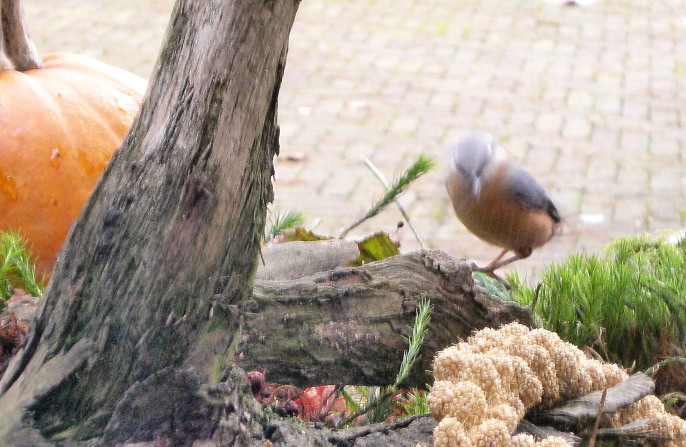 Nou, dat is wél ontdekt door onze engelachtige vrienden: naast de obligate mezen (kool- en kuif-) en merels schuift daar zélfs een enkele maal de veel schuwere Vlaamse Gaai aan. Vliegt die laatste nog direkt op als ‘ie achter ’t glas beweging waarneemt, zo niet de Boomklever. Die laat ons rustig koffie inschenken: hij eet effe lekker door..