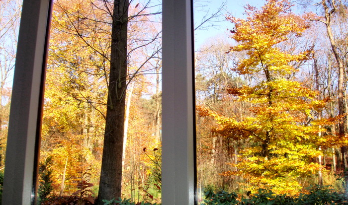 Er zijn nogal wat mensen in deze uiterst relaxete herfstbossen die zich de wijsgerige opmerkingen van een voig bericht betreffende het nut van schijnbaar zinloze HANDarbeid niet eigen hebben weten te maken. Zij schaften zich ter bestreiding van de bladermassa die zich zo fraai aandient (zie foto: ons uitzicht!) moedwillig een zogenaamde bladblazer aan. Een apparaat dat kans ziet met Loeiend Geweld (en ten koste van weer een deel van de Ozonlaag) het blad een meter ofzo opzij weg te blazen. Waarna de wind het weer gul verspreid tenzij je het bliksemsnel inpakt natuurlijk. Wat opvalt is dat het niet sneller of doelmatiger gaat dan vegen/harken, dus óók per week al gauw twee keer een uurtje of twee kost. In die tijd isoleer je jezelf echter wel én terroriseer je je omgeving kompleet. De winst zit ‘m dus uitsluitend bij de stroomleverancier en ’t verlies bij de gebruiker en de omwonenden in een straal van -zeg- een halve kilometer. Graag dus met spoed: een Verbod op Particuliere Bladblazers bij Wet [met een eventuele uitzondering voor lieden met een aantoonbare dwarsleasie die desondanks nog zelf tuinieren. ..]