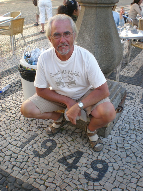 Voorts heb ik m’n tuinstoelen-keldertje onder ’t Chalet zo’n 15 cm. dieper gemaakt: dat betekende allemaal rottige houdingen, bij een ‘plafondhoogte’ van ca. 35 cm. hoog bij aanvang, met een klein schepje (want nauw) en in harde grond, die per schepje bovendien een meter of twee verder onder ’t huisje moest worden gezwiept. Helemáál Kapot dus! (Mijn bottenstelsel blijkt rijkelijk oud te worden voor zulke ongein.) Daarom Paasdagen met Kids in alle rust. Vandaag wat licht schilderwerk en morgen een lekkere fietstocht – en dan wordt ’t helaas weer als vanouds nat naar de verwachting der weerlieden… (De rest van de zonnedagen gaat een ander dus maar weer halen – of gewoon saai wachten op beter weer natuurlijk) Er blijft echter genoeg om naar uit te kijken: weer eens lekker lang op een stoel met een goed boek bijvoorbeeld. Het vaar-seizoen nadert natuurlijk ook weer. Én het blijkt dat ondergetekende alweer ruim 21.900 dagen op dees’ aardkloot toeft; da’s woensdag over een week precies 60 jaar – dus dat vieren we! En, zoals het bescheiden aantal genodigden al weet: op hóóg niveau. (Hieronder: Joop in Évora, Portugal, bij z’n eigen stichtingsjaar in de klinkers)