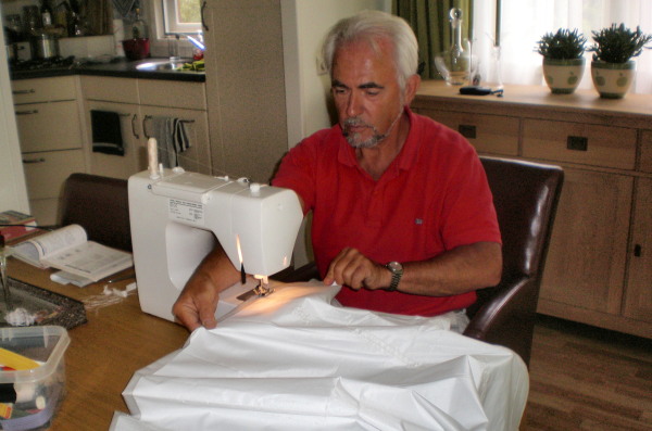 Gelukkig zijn we kreatief genoeg om ‘kleine, spontane vakantietochtjes’ in te lassen, zoals onlangs met het koepeltentje op de fiets een paar dagen nabij Deventer. Maar zelfs dáár komt weer w*** uit voort, zoals de behoefte om een zeiltje aan ’t tentje te kunnen knopen om (bij regen) bagage onder te leggen en/of zélf onder te kunnen schuilen als er bomen of struikjes zijn ter bevestiging. De laatst opgekomen behoefte is voorts een ‘plunjezak’, waar de beide slaapzakken in kunnen om die waterdicht bovenop de fietstassen te kunnen binden. Vandaar de tweede foto. (Zo zie je meteen, Gerard, waar de resten van je ‘zonne’zeildoek blijven!)