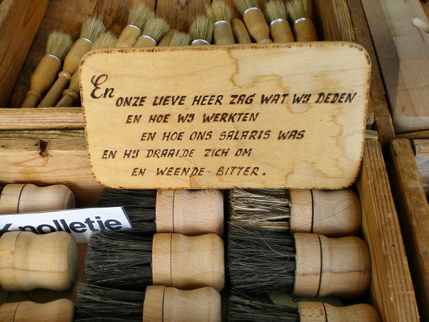 Gisteren was hier sprake van de bekende mengeling van ‘dorpsfeest’ en ’toeristen trekpleister/vakantie seizoen afsluiting’ die in vele plekjes plaatsvindt. Hier heet dat de “Oud Lunterse Dag”. Deel daarvan is een (heel grote) optocht met spullen van vijftig tot honderd jaar terug. Dit loopt van oude brandweerwagens, ploegen en trekkers tot en met breiende, bebrilde, van knotten en klompen voorziene “Oma’s” – die overigens in het échte leven soms amper 18 lentes tellen. In het superieur-platte dialect dat de Veluwe kenmerkt heet deze optocht “de Reutemeteut” en vond ze plaats onder het motto: “Ouwe Meuk blieft Leuk!” (vrij vertaald naar Nederlands: Oude Zooi blijft Mooi..) Dat zelfs in deze donkere, fundamentalistische contreien af en toe iemand het Licht ziet en dit ook nog durft uit te dragen moge blijken uit bijgaande foto van een klein detail uit de ‘Reutemeteut’ …