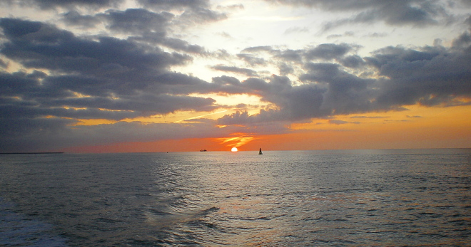 Inderdaad was ’t vrijdag ideaal weer voor de tocht naar ’t vasteland: 07.15 uur nét genoeg licht om te vertrekken (én direct daarna ook nog de boeien waar te kunnen nemen).