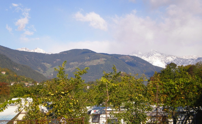 Na een nattige tussenstop in onze reis naar ’t Zuiden (op de ‘Legoland-camping’ nabij Ulm) reden we op 12 okt. de Brennerpas over – DWARS DOOR FLINKE  SNEEUWBUIEN HEEN ! Inmiddels zitten we op een prachtig plekje in de Dolomieten; bij het Italiaanse dorp Tisemo, op zo’n 600 meter hoogte. ’t Is hier prettig zonnig, terwijl je aan de lucht die je inademt merkt dat je (nog) in het hooggebergte vertoefd. Je kunt hier in de Dolomieten flink klimmen (er zijn heel wat routes -goed- aangegeven). Wij houden het op gewoon lekkere wandelroutes van een kilometer of 12 met een hoogteverschil van max. 400 meter; dus nog in de bossen en op de weiden, door beekdalen en over bruggetjes. En vooral niet te vergeten: door de gigantische appelteelt-akkers heen – een Reusachtig Fruitgebied hier; net zo aangelegd als de wijnvelden elders, maar dan wat hoger belijnt.  De échte toppen laten we al wandelend dus links (eventueel ook rechts) liggen.  Omdat we Watjes zijn, denk ik. DoloMietjes zijn we dus dus…Morgenvroeg gaan we weer zo’n 400 km. zuidelijker om tussen Florence en Pisa te belanden. [Wordt mogelijk (weer) geen Venetië deze reis, Michiel…]