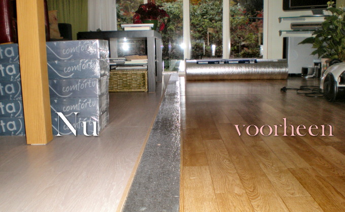 Terwijl buiten de bladblazers loeien is het ook in en rond ons Kabouterhuisje soms even lawaaiïg en is er sprake van uiterst laag-bij-de-grondse-werkzaamheden. Want wat Paulus (de enige échte Boskabouter wat ons betreft) nooit gehad heeft is in ónze Superpaddestoel dezer dagen een feit: een laminaatvloer. We gaan daarmee qua samenhangende tinten, lichtweerkaatsing e.d. van keurig naar poepsjiek.  Intussen ga ik qua motoriek van vitaal naar geknakt: dat laminaatleggen blijkt een lekkere aanslag op spieren en rug nu ik zestig ben – niet zoveel van gemerkt toen ik dit óók deed in Franeker, zo’n 25 jaar geleden (en dat waren drie keer zoveel m2).   Je komt bij gelegenheid natuurlijk  even kijken?!